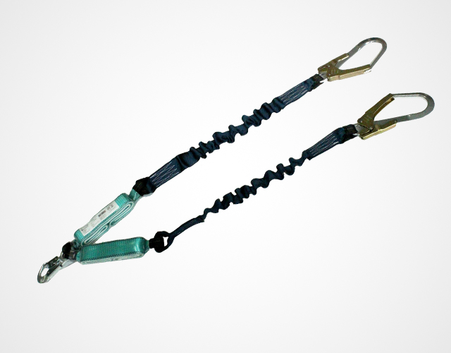 Talabarte de segurança duplo em cadarço de poliéster com elástico interno e absorvedor de energia duplo. Possui 1 conector classe T (20mm) e 2 conectores classe A (53mm).
