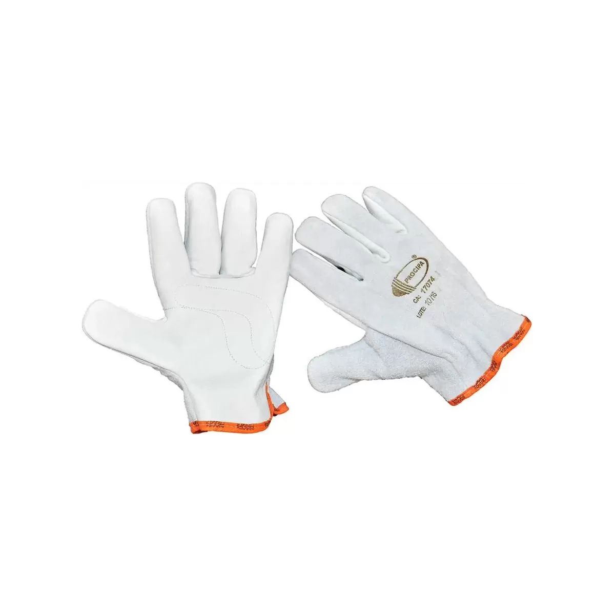 LUVA DE SEGURANÇA CONFECCIONADA EM VAQUETA NA PALMA E FACE PALMAR DOS DEDOS, DORSO E FACE DORSAL DOS DEDOS EM RASPA, REFORÇO INTERNO EM VAQUETA NA PALMA, ELÁSTICO NO DORSO.