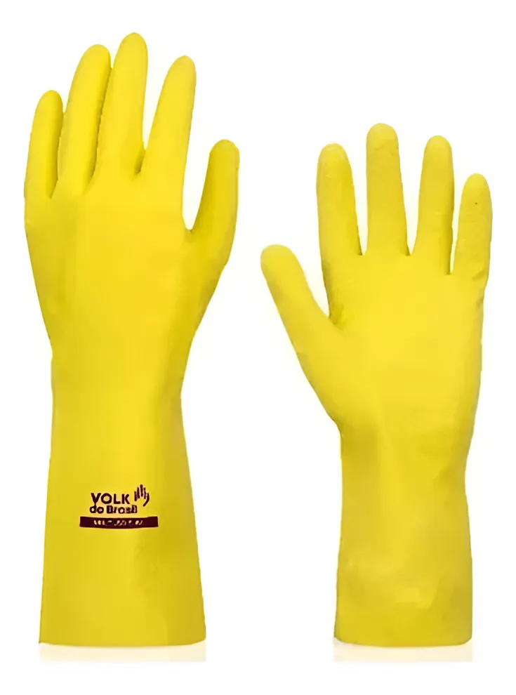 Luva de segurança confeccionada em látex natural, revestimento interno em flocos de algodão e relevo antiderrapante na palma e ponta dos dedos.